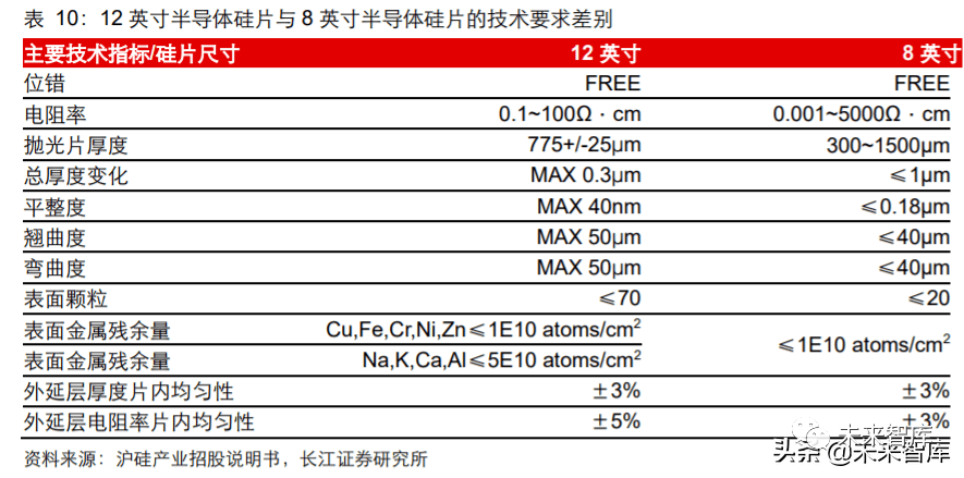 技术壁垒方面:随着半导体制程不断缩小,芯片生产的工艺愈加复杂,生产成本 不断提高,成本因素驱动硅片向着大尺寸的方向发展。半导体硅片尺寸越大,对 于技术和设备的要求越高,半导体硅片的尺寸每进步一代,生产工艺的难度亦随 之提升。