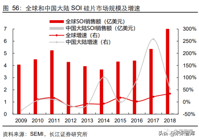 受 5G 通讯在全球范围内推广普及影响,射频前端市场与 SOI 硅片市场前景广阔。根据 Yole Development 统计分析,由于 5G 标准的逐步推行,预计射频前端市场规模将由 2017 年的 150 亿美元上升至 2023 年的 350 亿美元,年均复合增长率达 15.2%。作为 射频前端器件的生产原材料,SOI 硅片生产工艺更复杂、成本更高、应用领域更专业。根据 SEMI 统计,2016 年至 2018 年全球 SOI 硅片市场销售额从 4.4 亿美元增长至 7.2 亿美元,年均复合增长率 27.5%;同期,中国 SOI 硅片市场销售额从 0.02 亿美元上升 至 0.11 亿美元,年均复合增长率 132.5%。