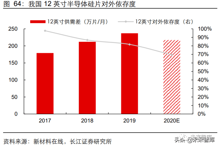 中国半导体硅片对外依存度逐年下降,12 英寸硅片对外依存度依旧较高。根据新材料 在线 英寸半导体硅片对外依存度为 6%,预计 2020 年对外依存度 下降至约 2%,基本实现完全国产替代。2019 年我国 12 英寸半导体硅片对外依存度为 82%,预计 2020 年对外依存度下降至约 70%,仍处于较高水平。由于国产硅片龙头沪 硅产业已经开始向中芯国际等晶圆制造企业供应 12 英寸半导体硅片,预计 2020 年我 国 12 英寸半导体硅片的供需差较 2019 年有一定下降。