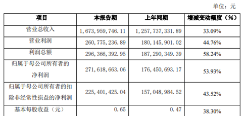 同时,其营业利润、利润总额、归属于母公司所有者的净利润、归属于母公司所有者的扣除非经常性损益的净利润分别增长44.76%、58.24%、53.93%、43.52%,主要为华兴源创营业收入增长显著,同时报告期内华兴源创取得政府性的研发、兼并重组补助显著增加共同所致。