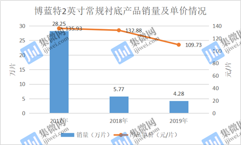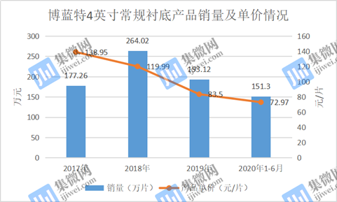 目前,博蓝特PSS产品有2英寸常规衬底、4英寸常规衬底、4英寸复合型衬底。其中2英寸常规衬底产品销量从2017年的28.25万片,到2018年大幅度下跌至5.77万片,2019年再进一步下降,仅为4.28万片,2020年上半年甚至都没有销量。其产品单价也从2017年的135.93元/片,到2018年下降至132.88元/片;2019年进一步下降到109.73元/片。