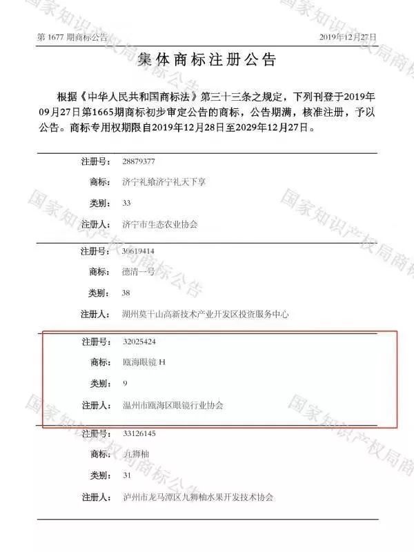 国家商标局发布了重要的公告宣布,以瓯海地名申请的集体商标“瓯海眼镜”,已经正式通过注册审核!商标专用权限自2019年12月28日至2029年12月27日。